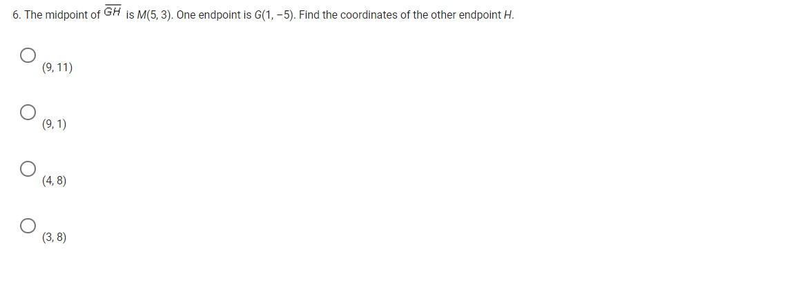 whose midpoint is M(x, y) = (5, 3) and known endpoint is G(x, y) = (1, -5) is the point H(x, y) = (9, 11).