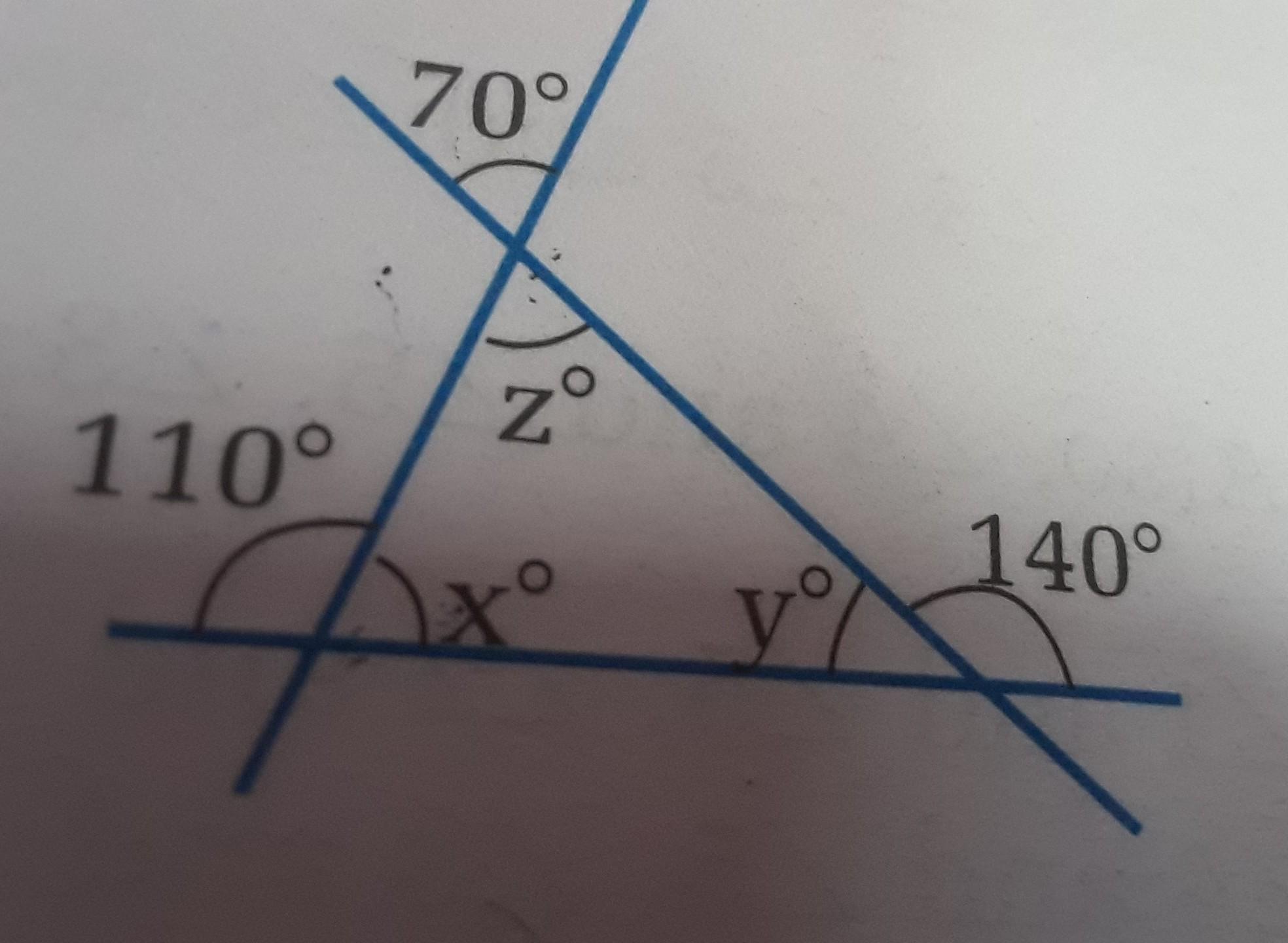 For z there is two methods, you can use the fact that opposite angles are congruent, or you can use the fact that the sum of the interior angles of a triangle is 180 degrees. This means that x+y+z=180 and since we know that x=70 and y=40 then 70+40=z so 110+z=180 so z=70, which is also the same as the opposite angle, you could use either method although knowing that opposite angles are congruent is much more easier. It's called the vertical angles theorem.