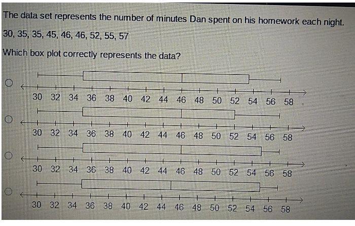 The box plot first represents the data set option first is correct the third quartile lies between 52 to 54.