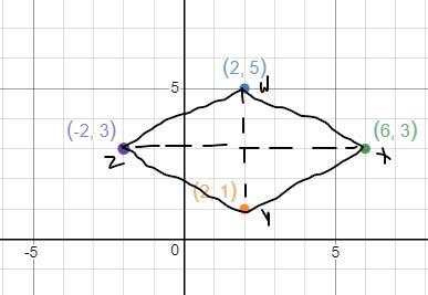 Hence if the three vertices of the rhombus are W(2,5),x(6,3),Y(2,1) then the area of the rhombus is 16 square units.