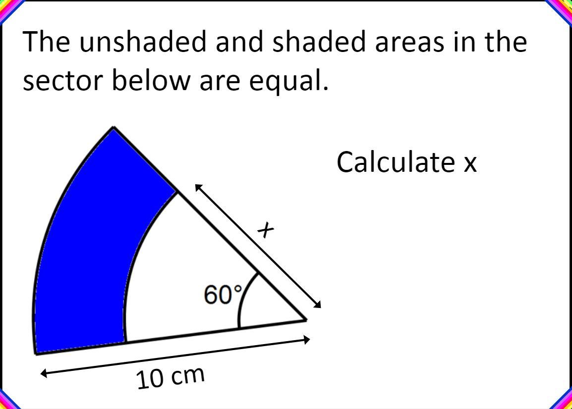 area of the unshaded portion = 6000 / 360 π ÷ 2 = 6000π / 720 =  26.1666666667 = 26.2 cm