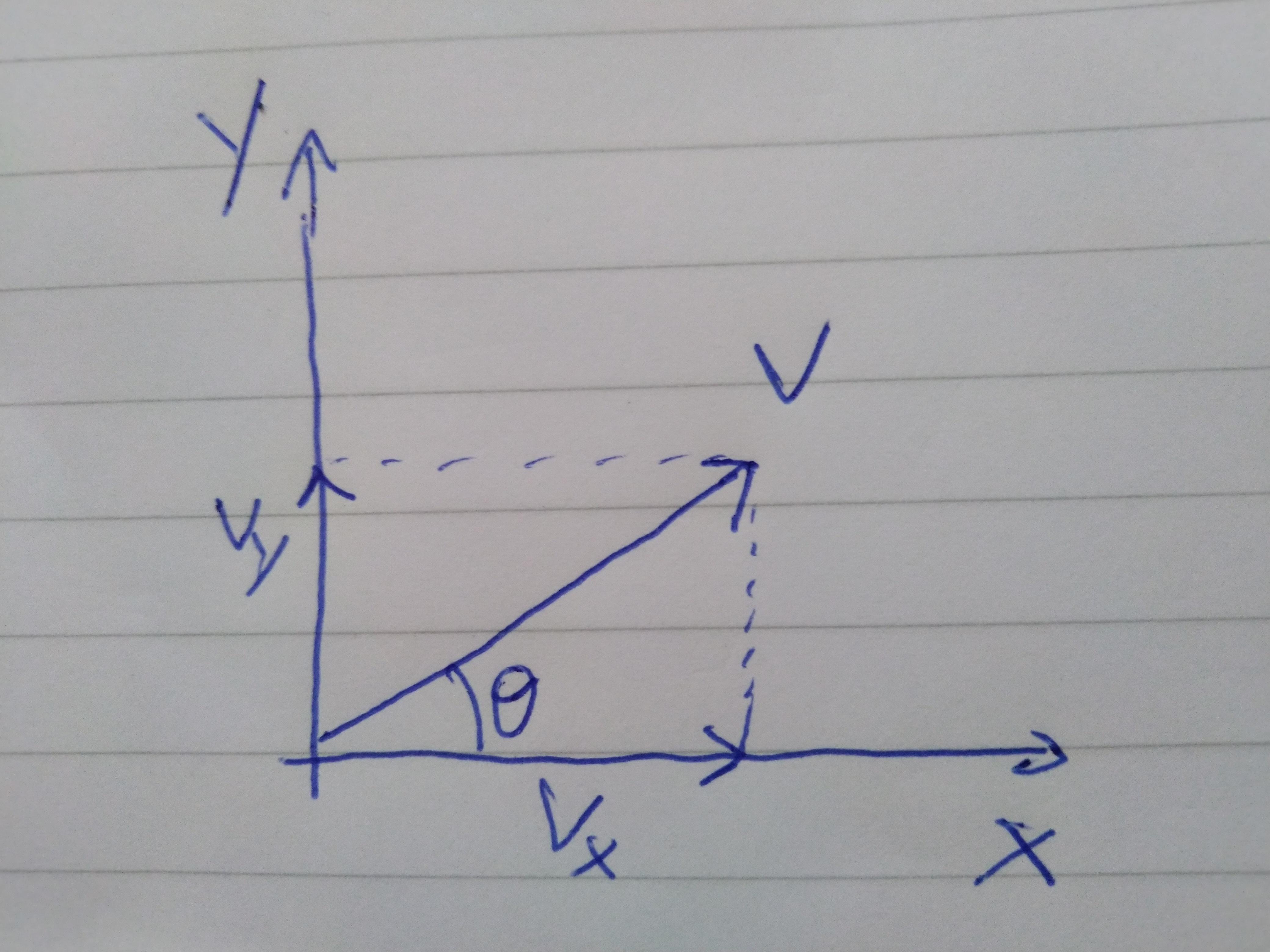 The horizontal and vertical components are also represented, obtained by projecting the vector itself along the x- and y- axis, and they are indicated with