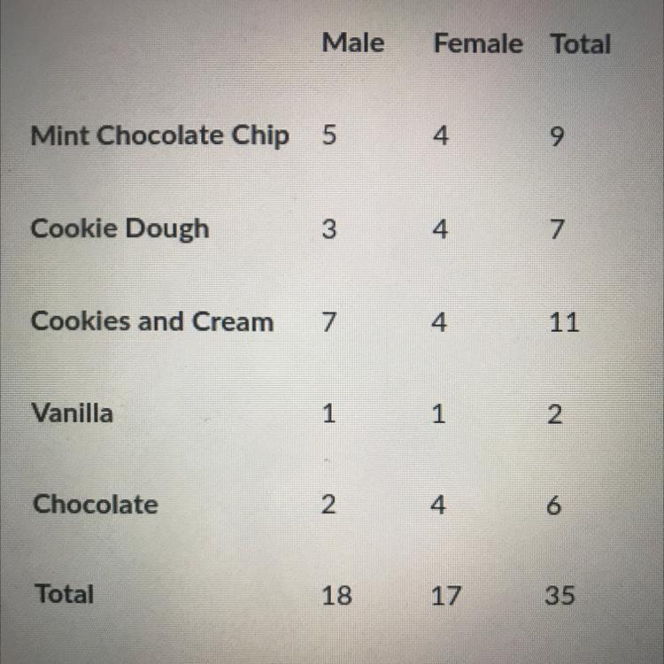Out of the same 35 people, 11 people prefer cookie and cream and 2 people prefer vanilla, hence: