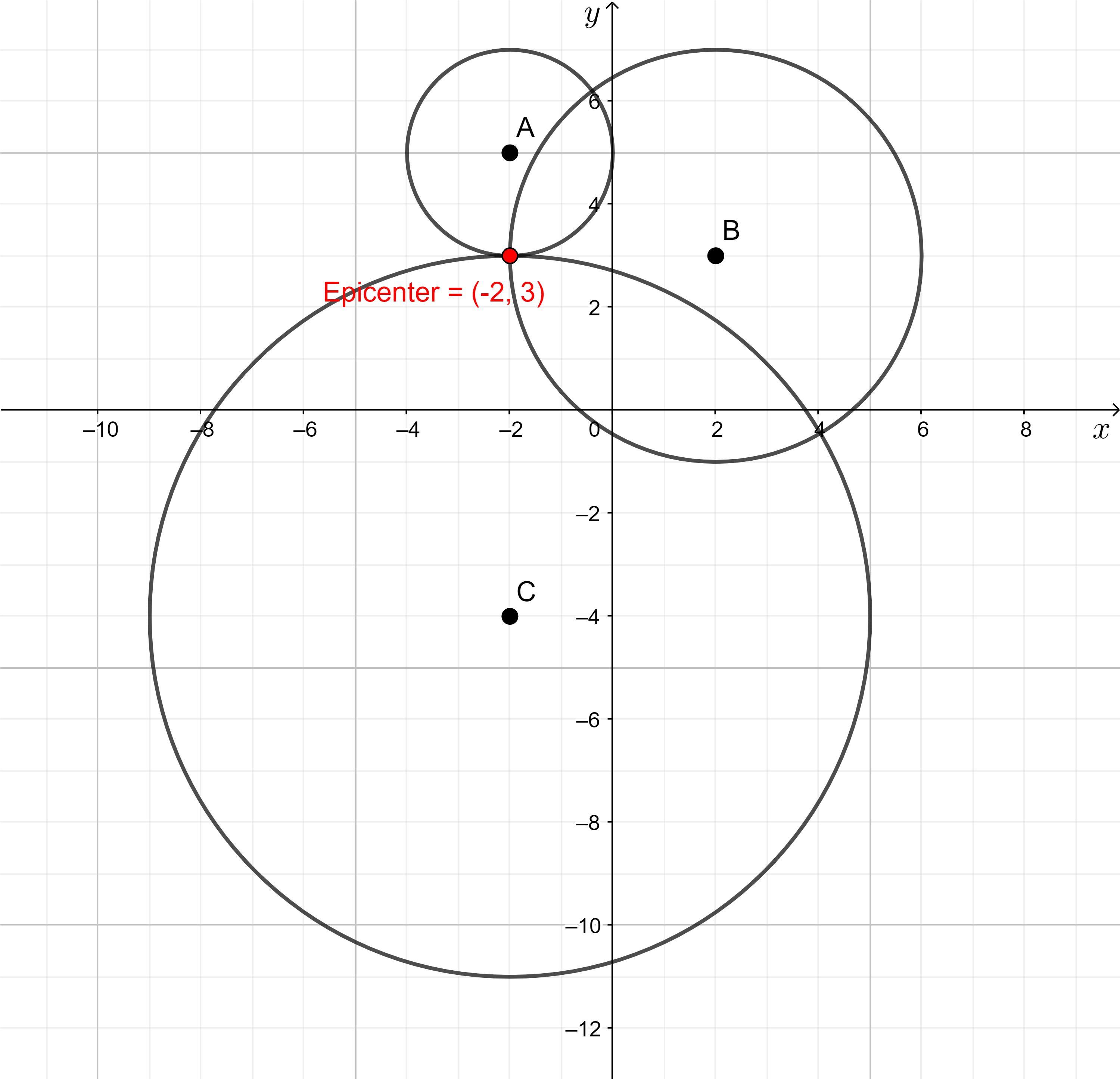 Therefore, the <u>point of intersection</u> of the three circles if (-2, 3) and hence the location of the earthquake's epicenter is (-2, 3).