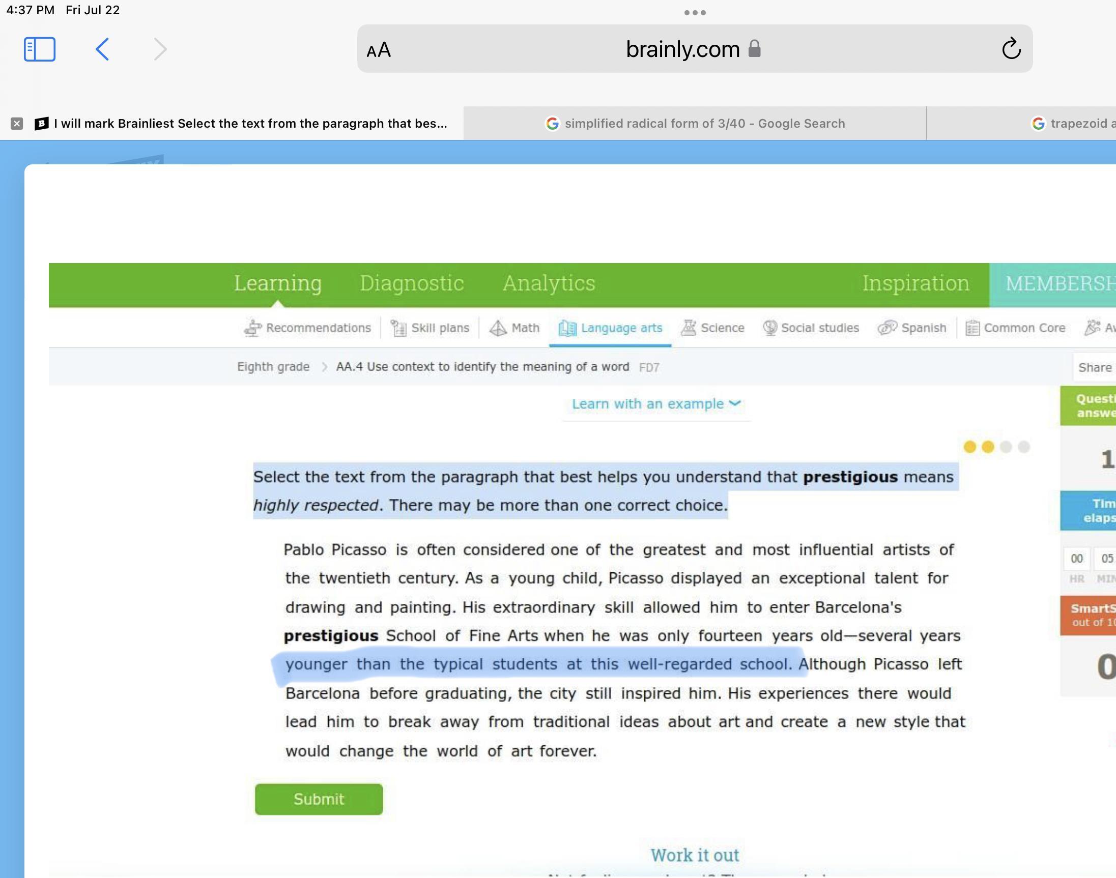 I will mark Brainliest Select the text from the paragraph that best helps you understand that prestigious means highly respected