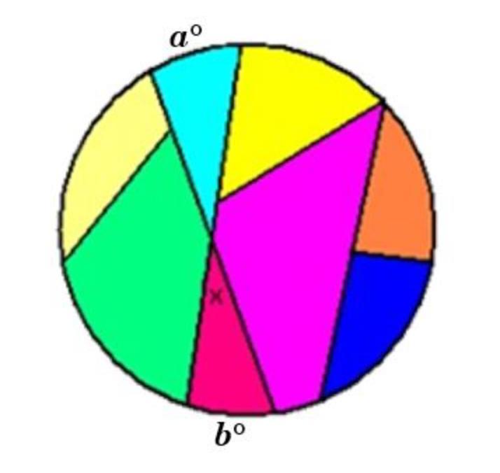 Maria is creating a round stained glass window like the one below. She needs to cut the dark pink glass to the correct size to f it into the frame. At what angle (x) should she cut the glass so that it fits if she knows the arc measure of a is 35º and the arc measure of b is 45º. What does x equal?