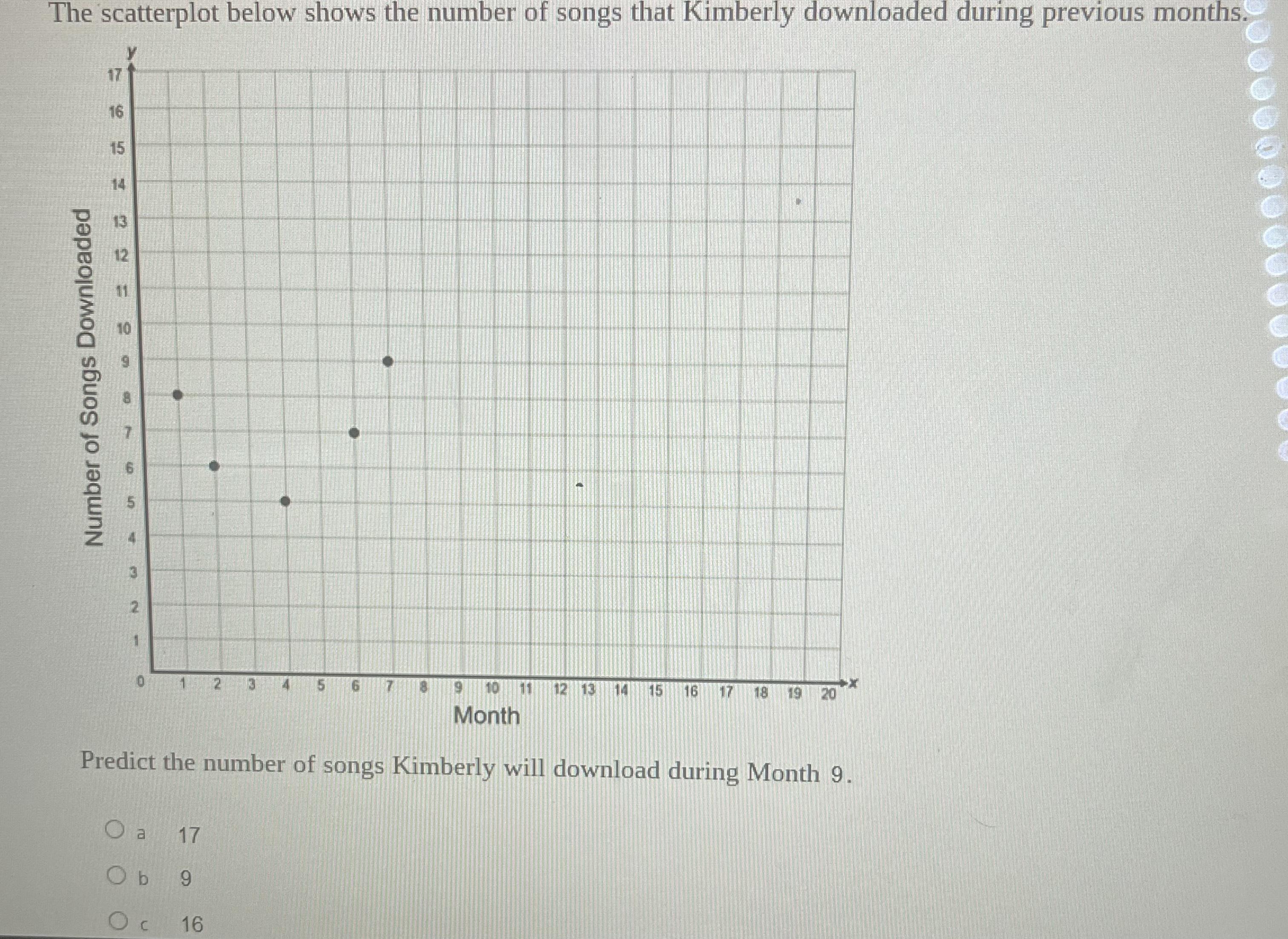 Using a quadratic regression equation, it is found that the prediction of the number of songs that Kimberly will download on Month 9 is of: