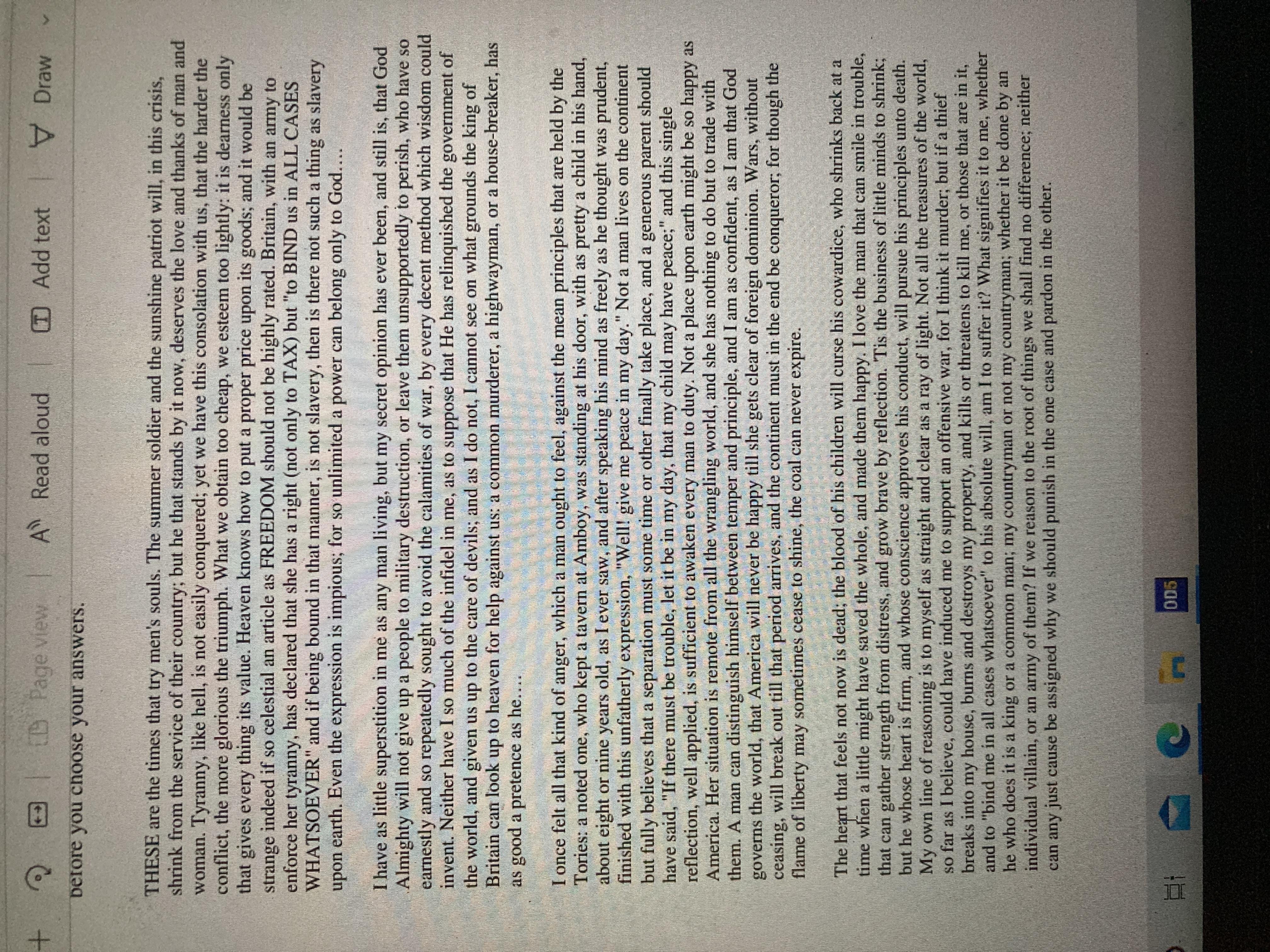 Questions 11-20. Read the following passage from Thomas Paine’s The Crisis (1776) carefully before you choose your answers. Whic