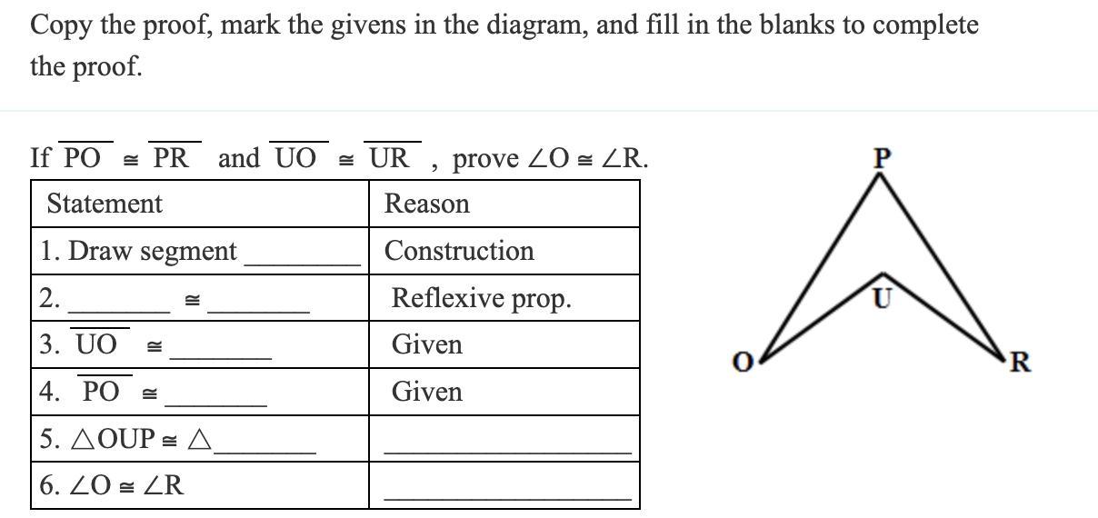 copy the problems onto your paper, mark the given and prove the statements asked. if PO is congruent to PR and UO is congruent t