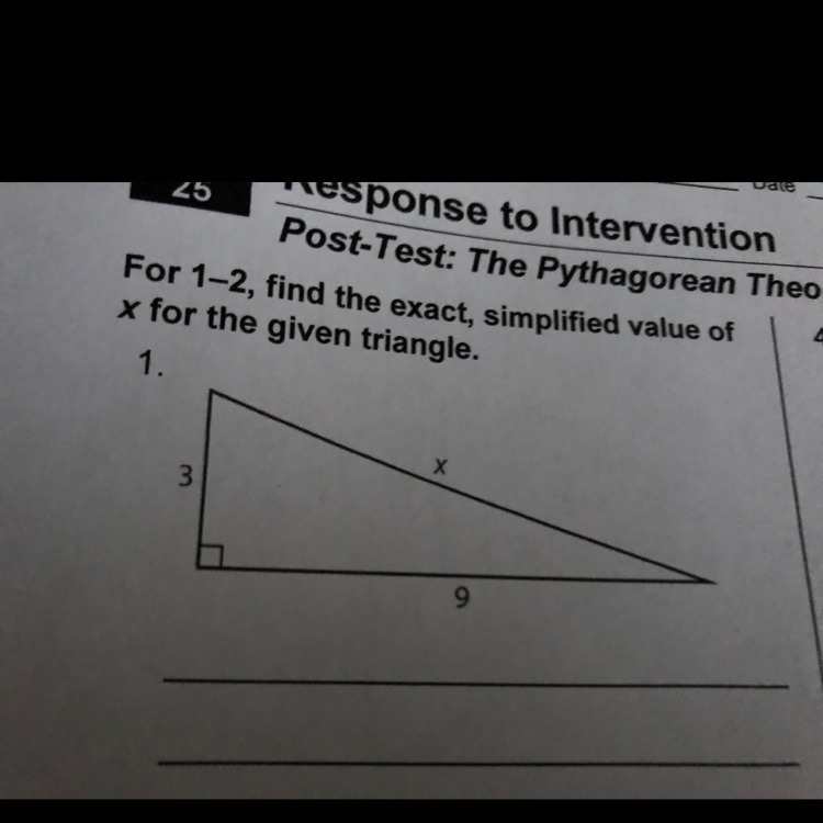 Since you are given the two shorter legs of this triangle, 3 and 9, and you are also given that it is a right triangle, you can find x by using the Pythagorean Theorem: