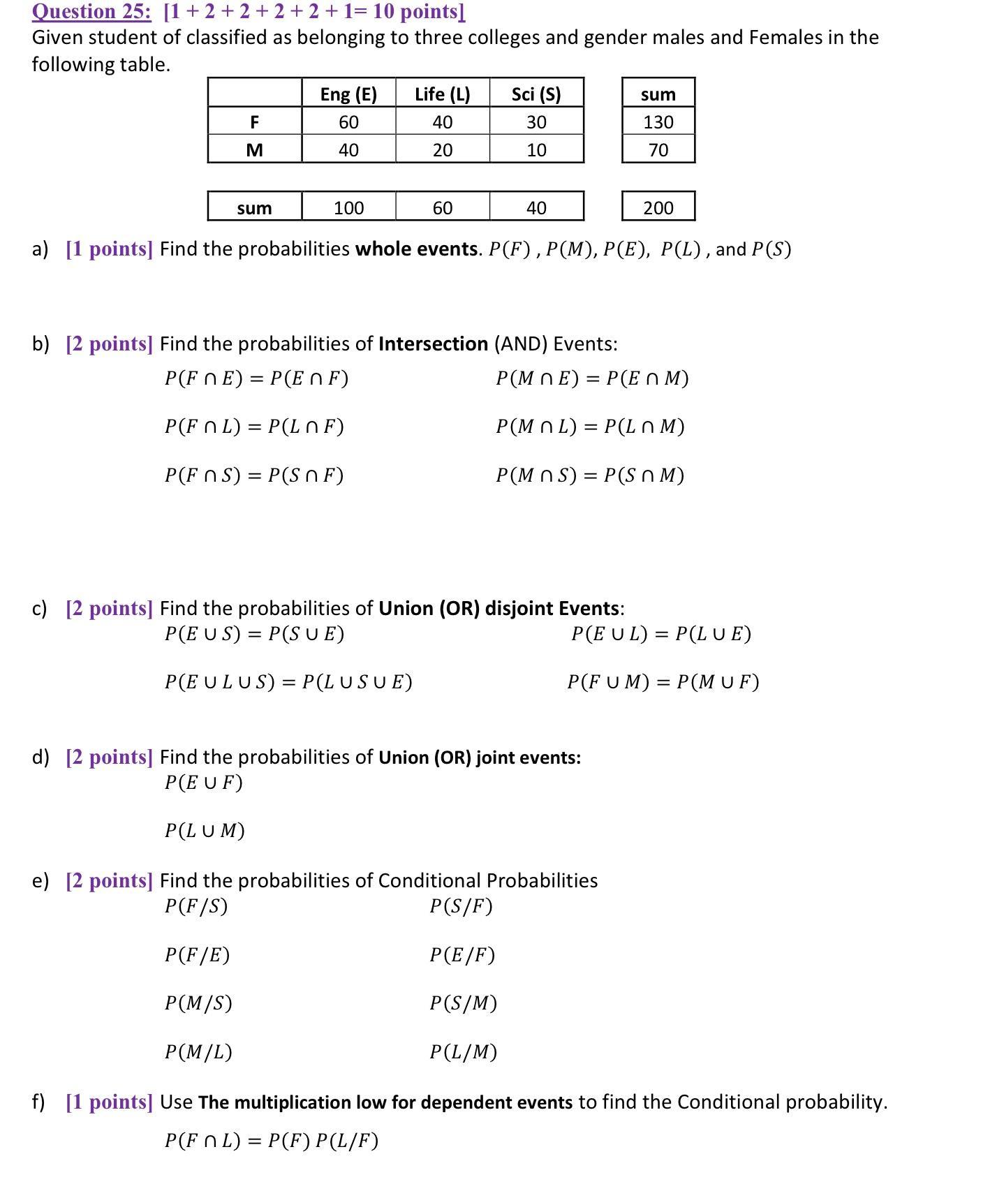 P(F u M) = P(F) + P(M) = 130/200 + 70/200 = 1
