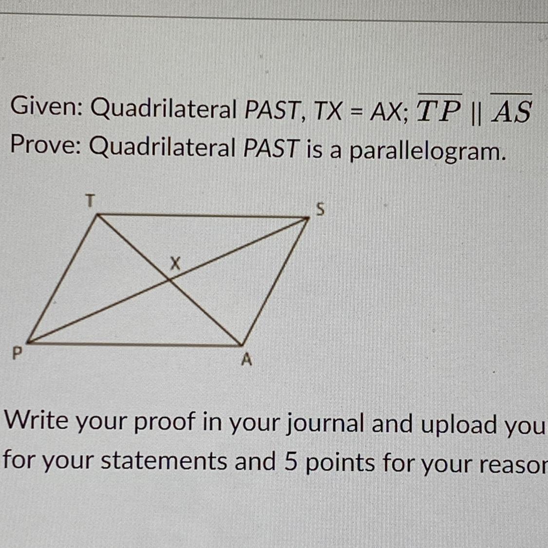 5) PAST is a parallelogram (a quadrilateral with two pairs of opposite congruent sides is a parallelogram)