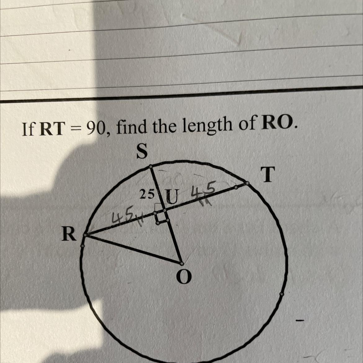 In the given figure of circle, if RT = 90, SU = 25, and SO is perpendicular to RT, the length of the radius RO is 53.