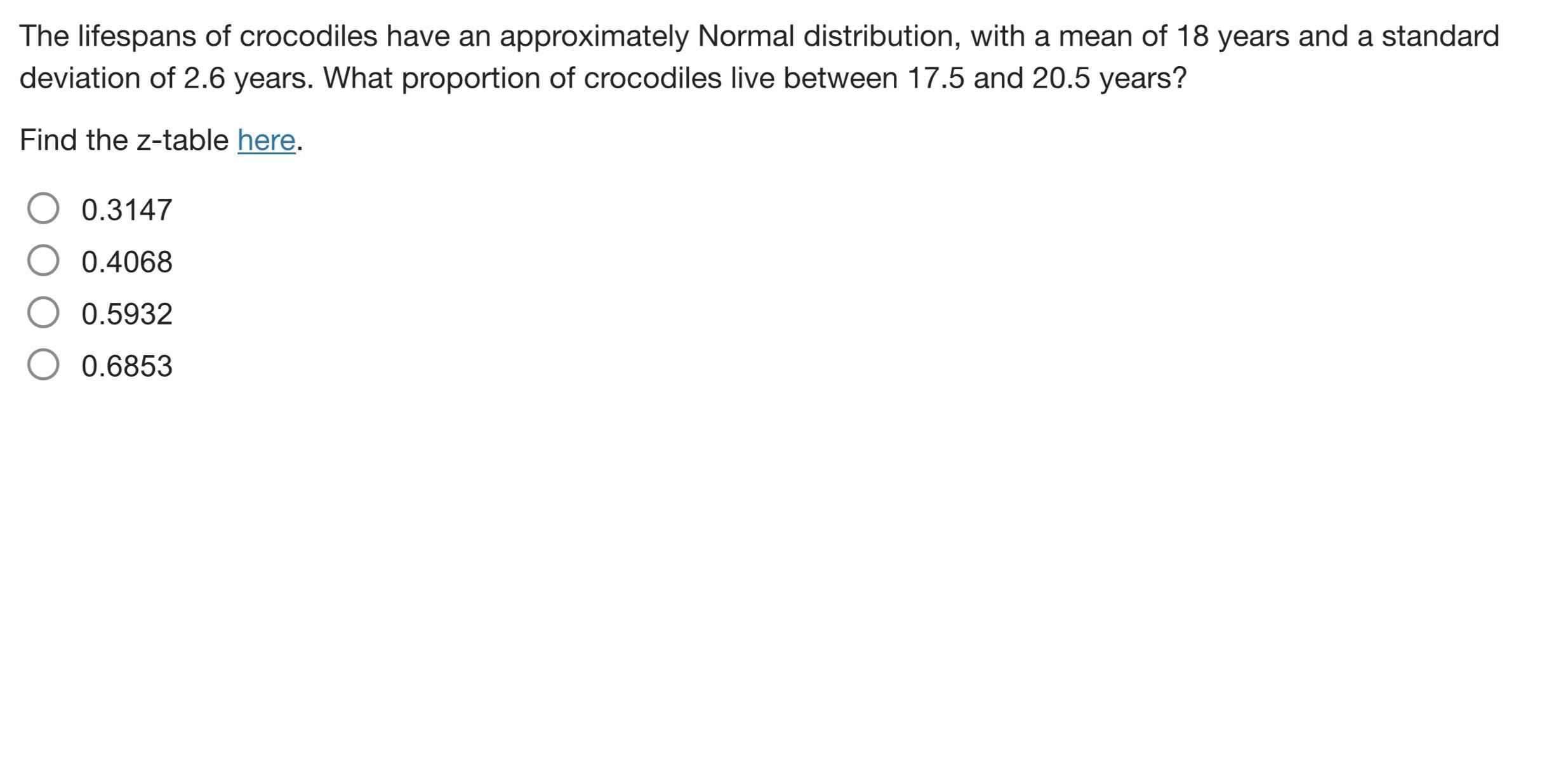 The proportion of crocodiles live between 17.5 and 20.5 years is the <u>p-value of Z when X = 20.5 subtracted by the p-value of Z when X = 17.5</u>, hence:
