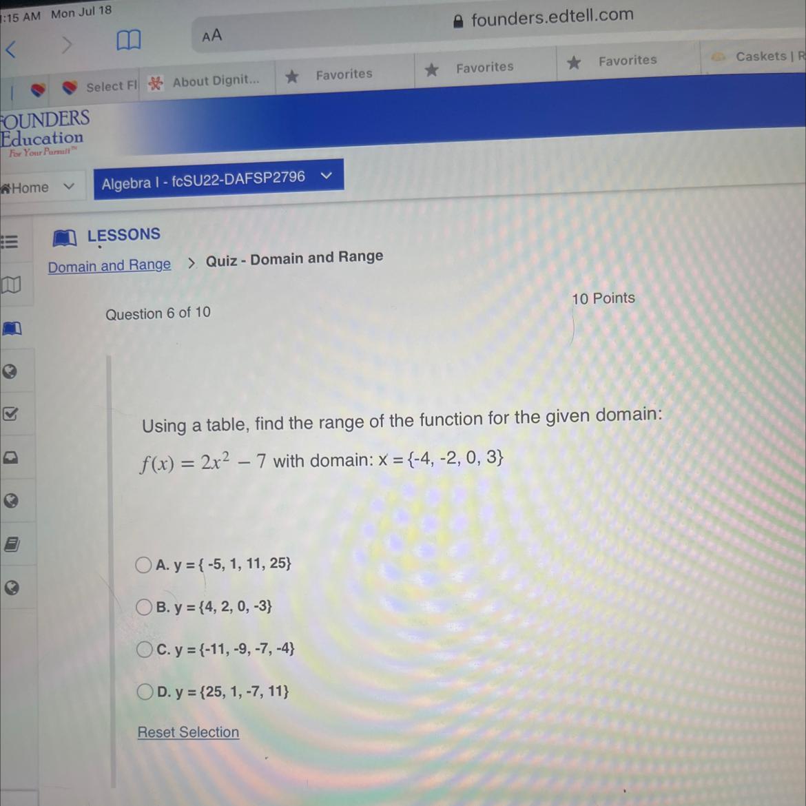 The range of the function f(x) = 2x² -7 with domain: x = {-4, -2, 0, 3} is y = (25, 1, -7, 11). Option D is the correct answer.