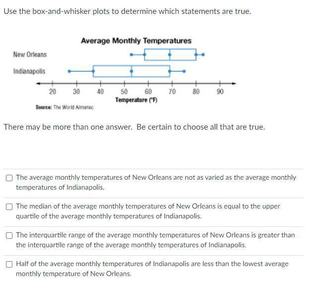 The median of the average monthly temperatures of New Orleans is equal to the upper quartile of the average monthly temperature of Indianapolis.