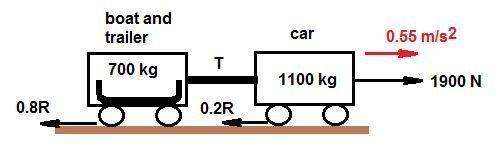 Force in the hitch = T NAcceleration = 0.55 m/s²