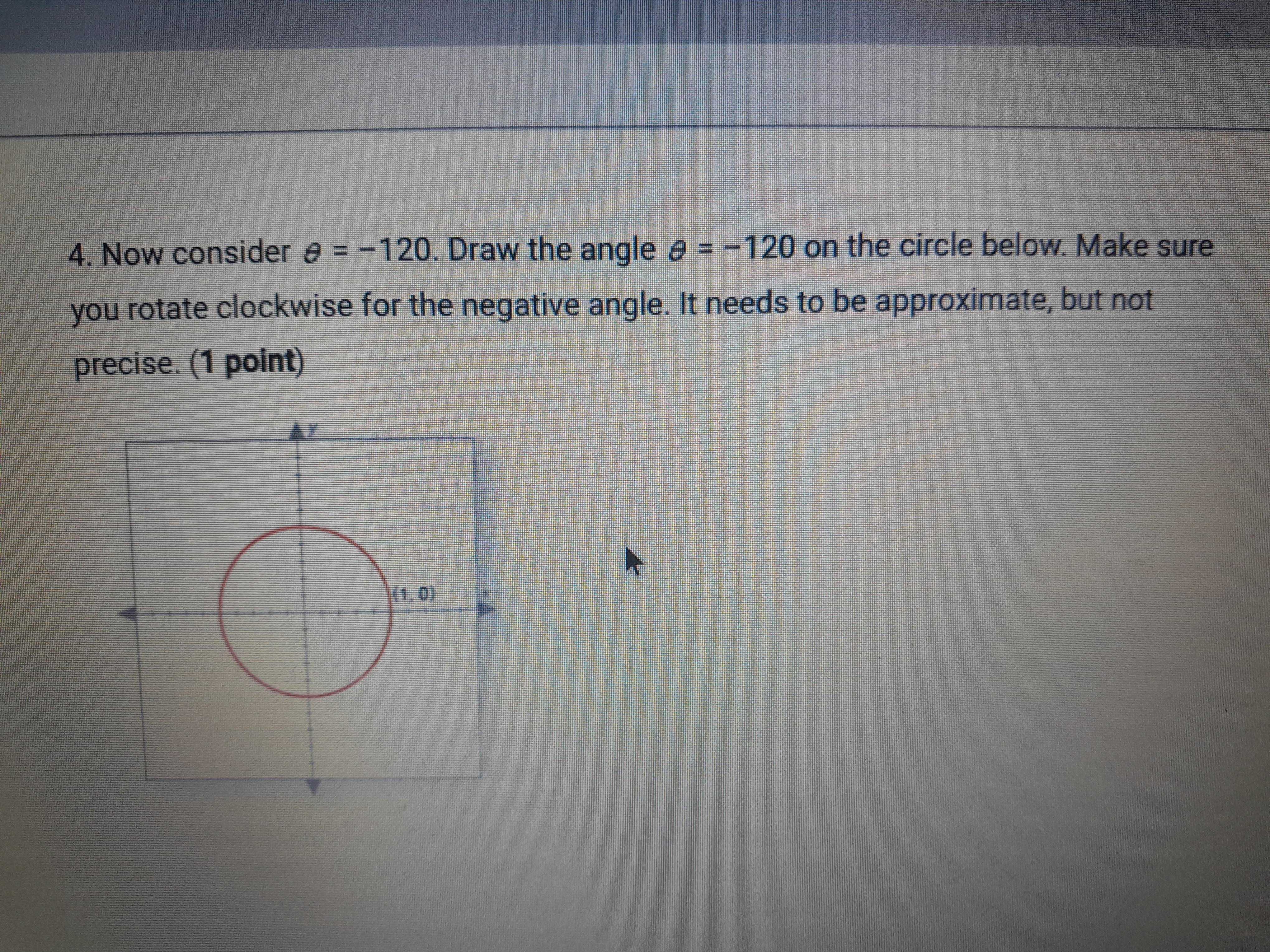 To draw the angle θ = -120° in the unit circle, we will move clockwise 90°, and thereafter another angle of 30°.