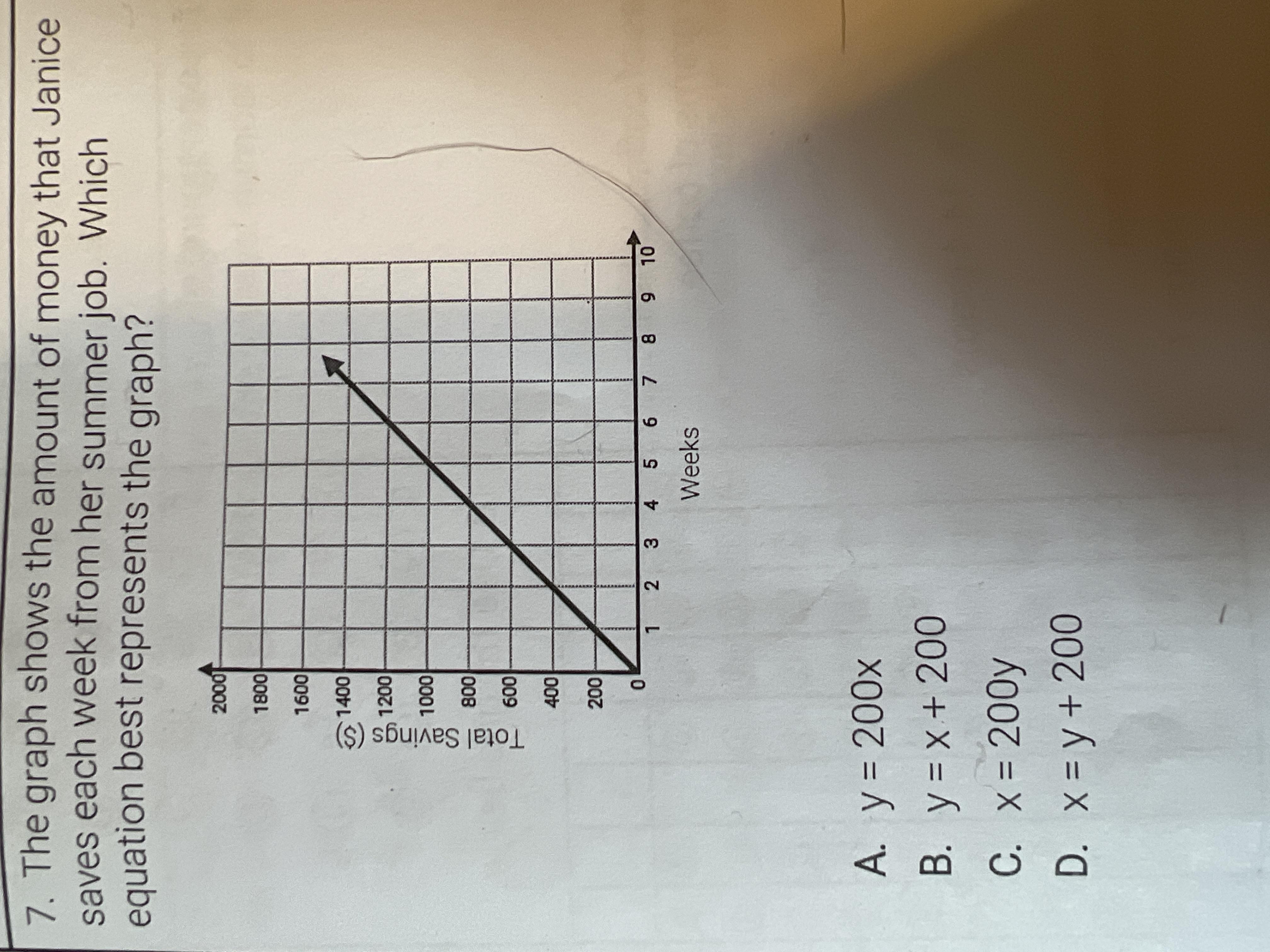 The equation which best represents the graph shows the amount of money that Janice saves each week from her summer job is option A which is y=200x.