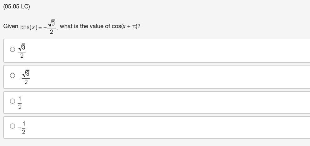 Hence, the value of cos(x+π), when the value of cos(x)=-(√3)/2 is √3/2.