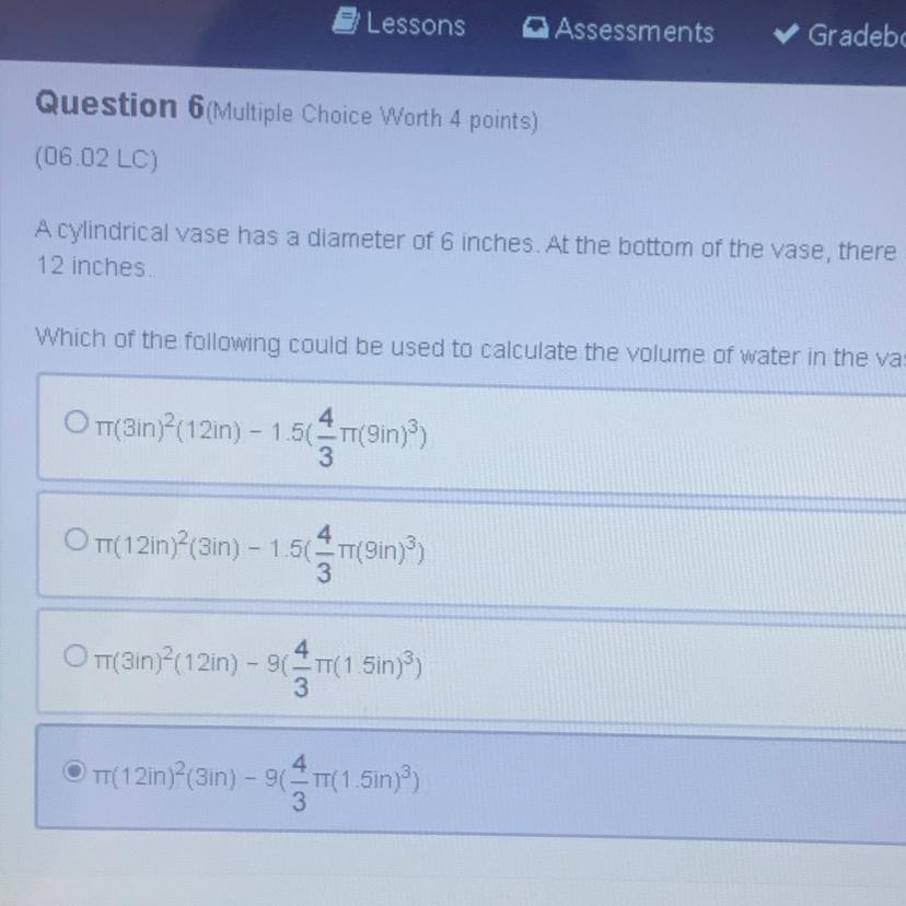 Therefore, the volume of a cylinder with a base of diameter 6 in and a height of 12 in is: