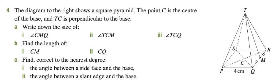In this problem we have a <em>right</em> pyramid as line segment TC is perpendicular to the base PQRS, which means that any line coplanar with PQRS is perpendicular to line segment TC. i) the measures of the angles are m ∠ TCM = m ∠ TCQ = 90°.