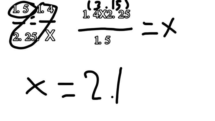 You would put 1.5/2.25 and then 1.4/x. After that, multiply 2.25x1.4 to get 3.15. After that divide 3.15 by 1.5 to complete the cross multiplication, getting you 2.1.