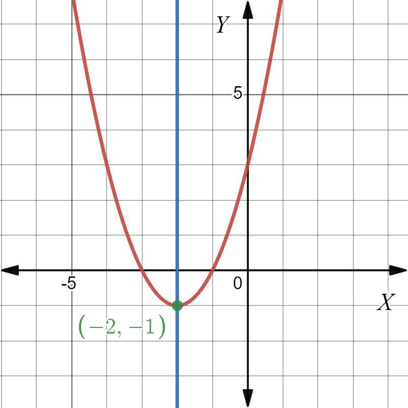 Plotting the function on the graph as shown below, the vertex of the parabola will be at (-2,-1). Also, the parabola is in terms of x, therefore, the symmetry of the parabola will be perpendicular to the x-axis and will lie at x=-2.