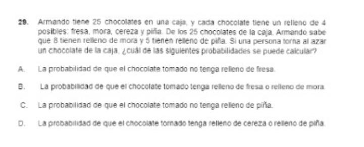 Sabemos que 5 chocolates tienen relleno de piña, entonces 20 no tienen relleno de piña. es decir, la probabilidad es: