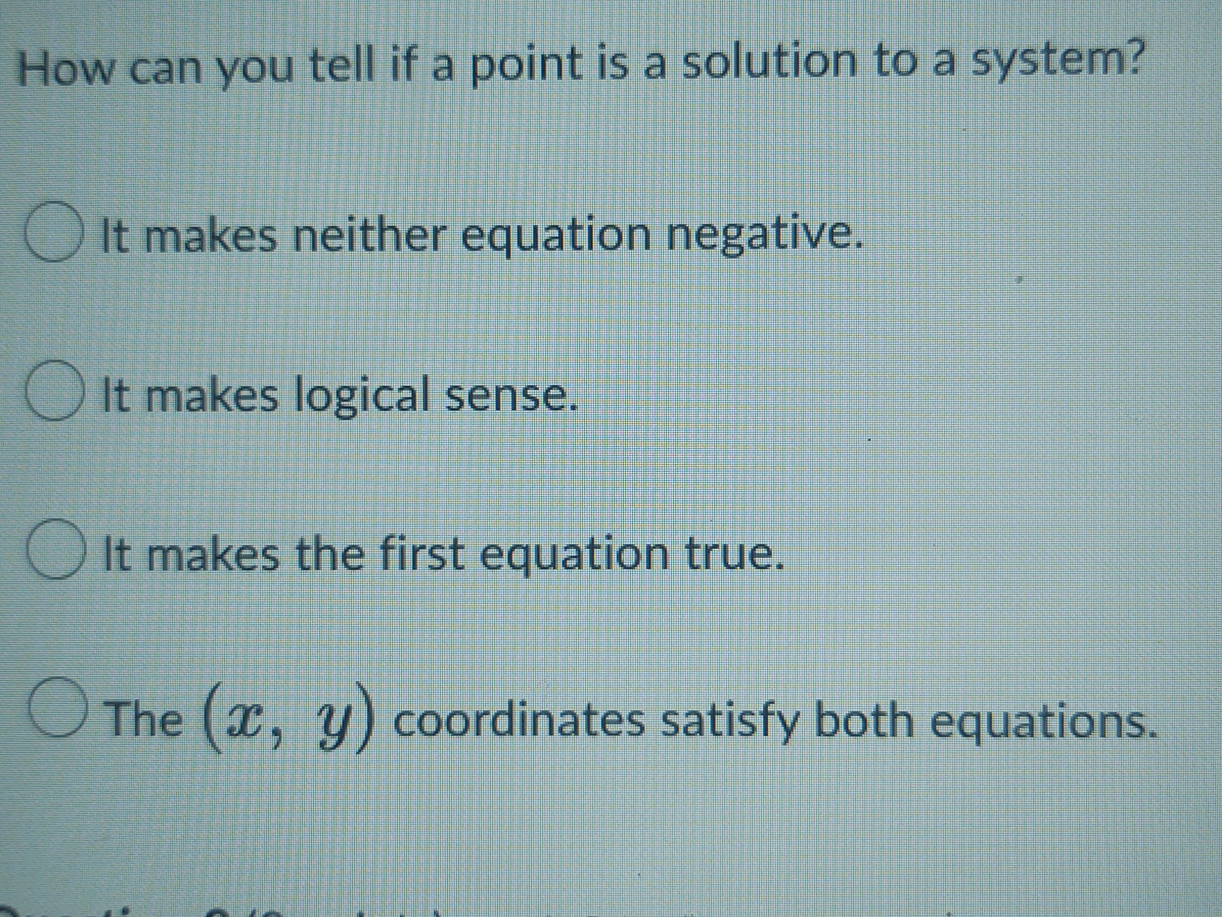 If a point is a solution to the system, then the point (x, y) coordinate will satisfy both the linear equation.