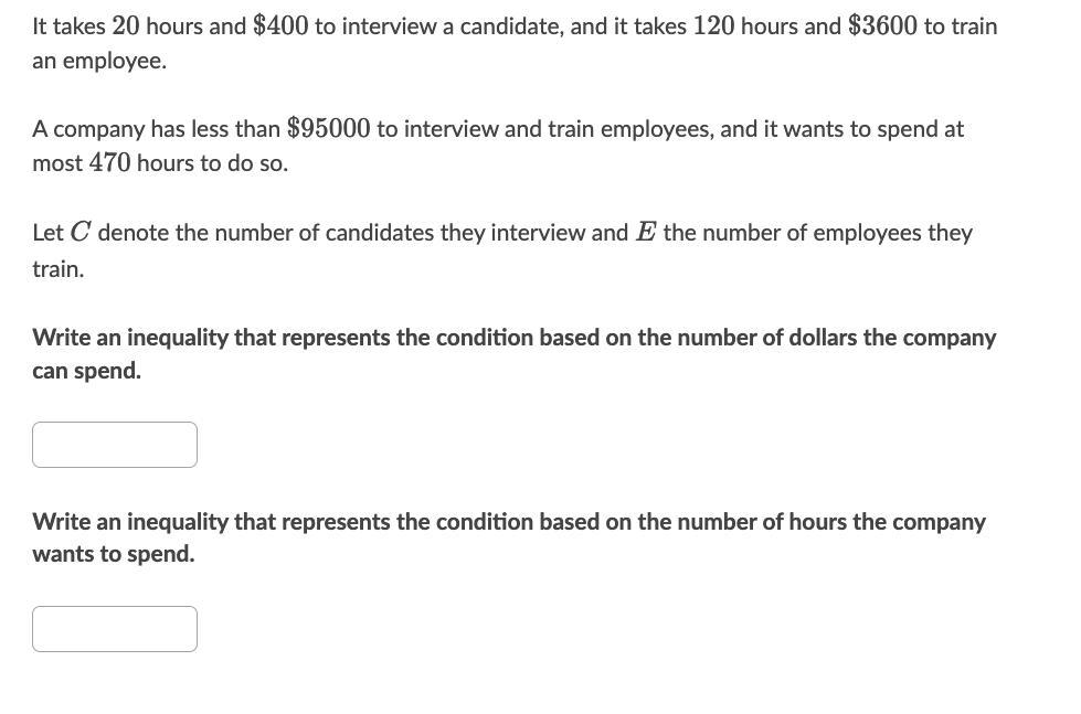 The company can spend less than $95000 to interview and train employees and can spend at most 470 hours to do so.