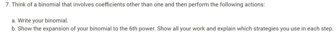Expanding the binomial to the 6th power means to multiply the binomial by itself six times.