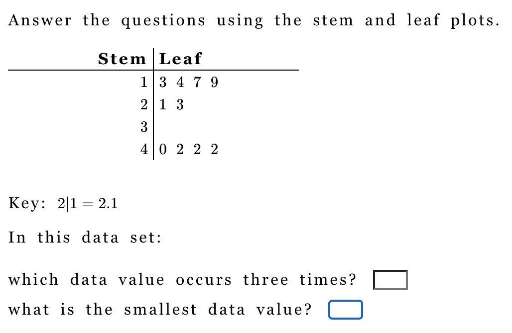 From the given data, you can see that the value that occur three times is. 42 and the smallest of the data is 13