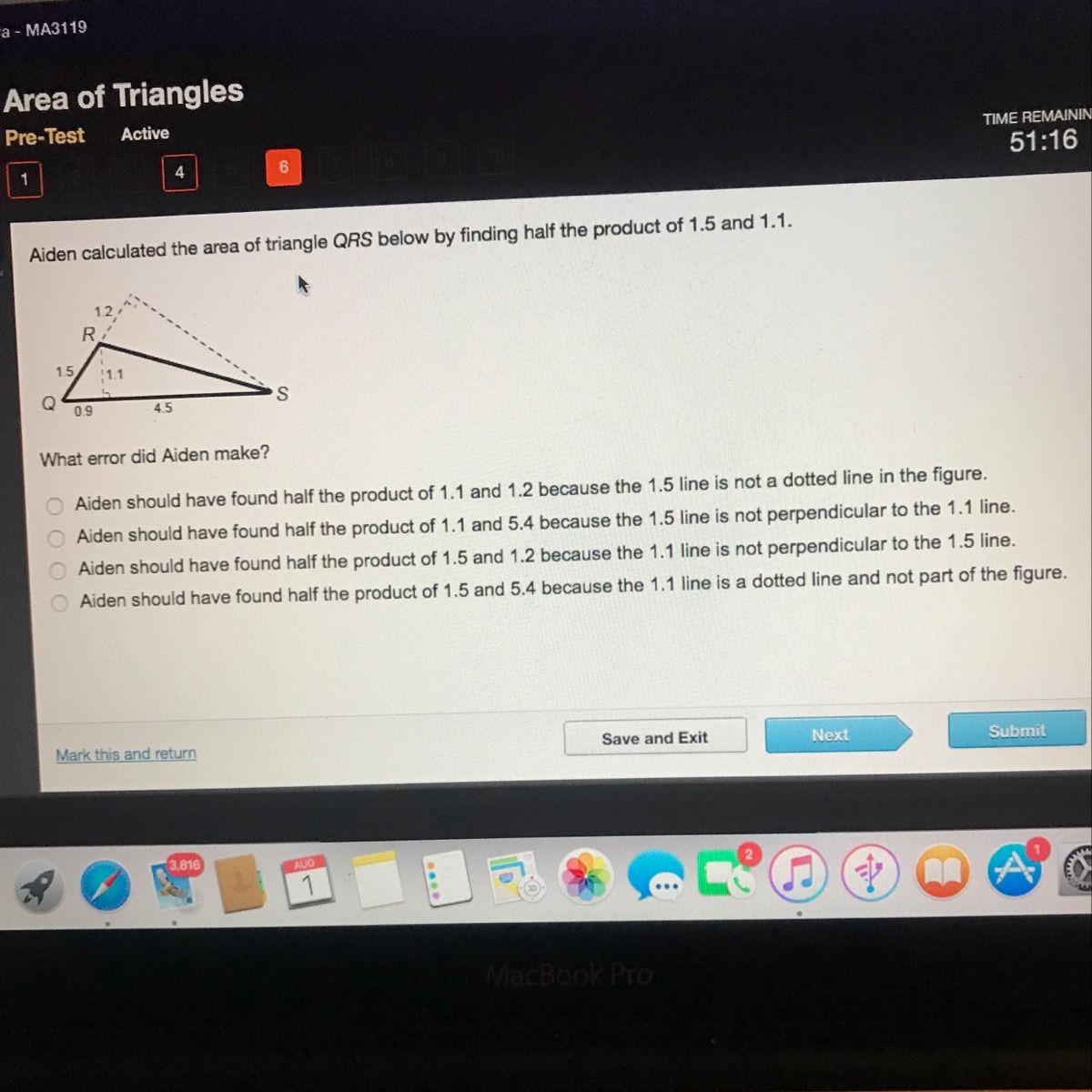 Thus, Aiden should have found half the product of 1.1 and 5.4 because the 1.5 line is not perpendicular to 1.1 line.