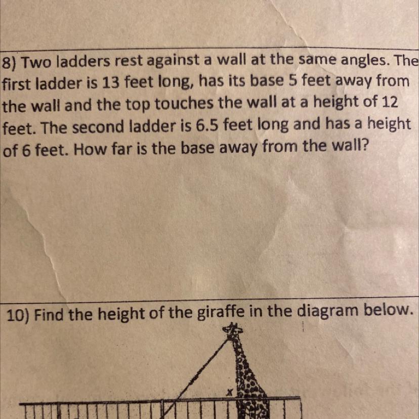 (distance from wall)/(ladder length) = x/(6.5 ft) = (5 ft)/(13 ft)