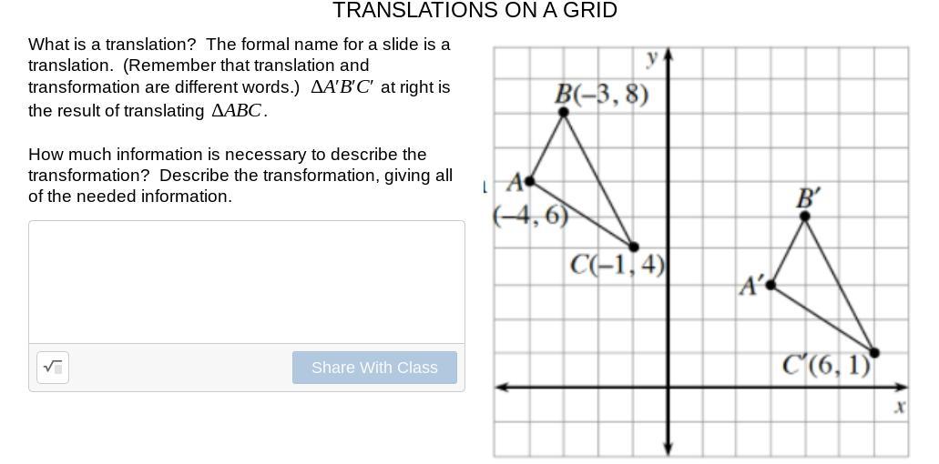 You want to know all of the information necessary to describe the translation of ΔABC to ΔA'B'C', given C(-1, 4) and C'(6, 1).