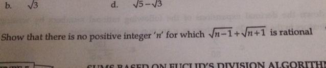 Hence by contradiction we can prove that there is no positive integer 'n' for which √(n-1) + √(n+1) is rational.