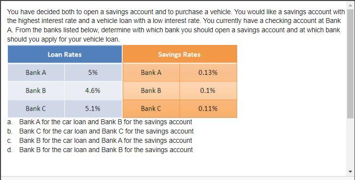 <h3>Bank B for the car loan and Bank A for the savings account open a savings account and to purchase a vehicle.?</h3>