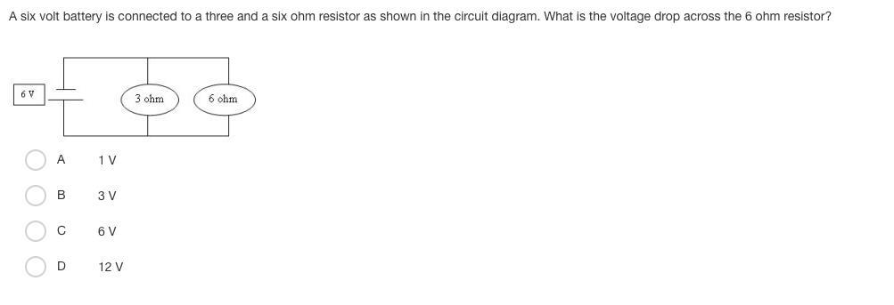 6 V drop occurs across the 6 ohm resistor in the parallel circuit diagram. The correct answer is C.