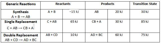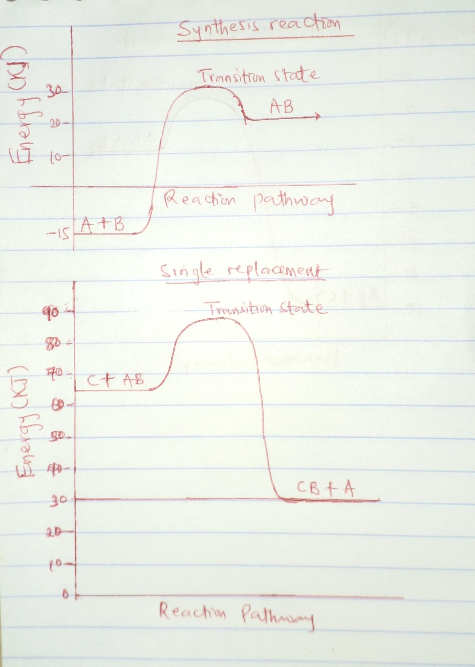 The energy diagrams of the synthesis, single replacement, and double replacement reactions are found in the attached image.