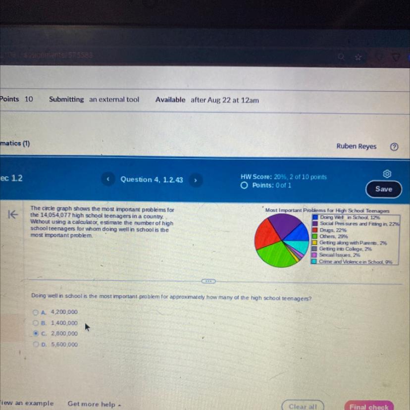 According to the circle graph, doing well in school is a problem that affects B. 1,400,000 high school teenagers.