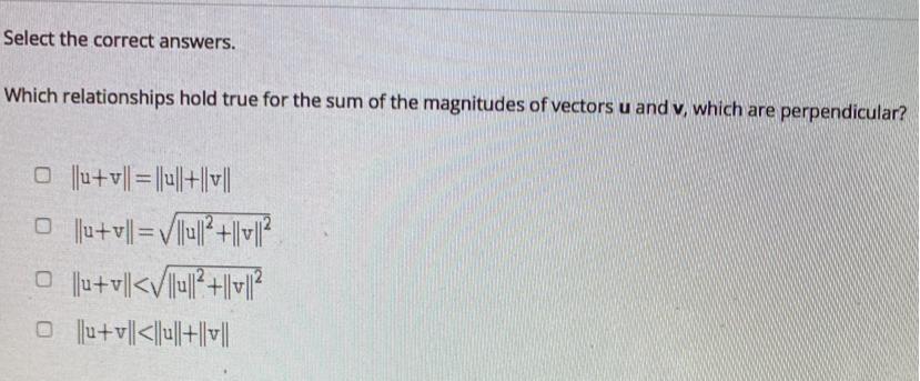 In the question, we are asked to identify the relationships that hold for the sum of the magnitudes of vectors u and v, which are perpendicular to each other.