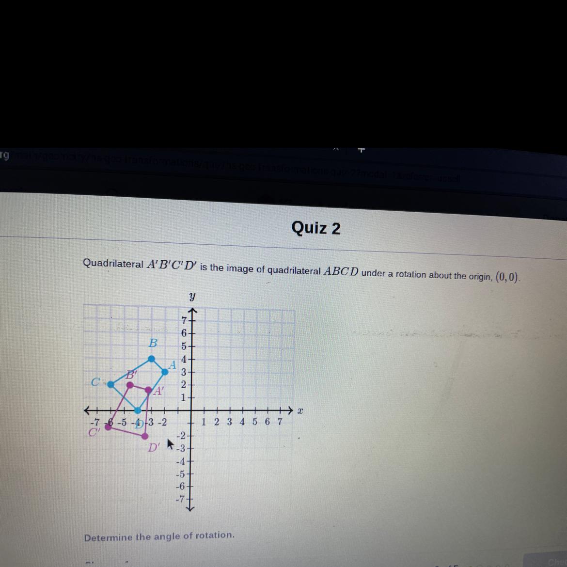 The rotation of the quadrilateral ABCD about the origin (0, 0), to get the quadrilateral A'B'C'D' is 30°