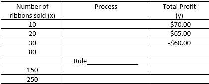 The cheerleaders want to raise money to go to camp, so they decide to sell spirit ribbons. They will earn 50¢ for each ribbon th at they sell. However, they have to purchase the ribbons first for a total cost of $75. Use the table below to figure their total profit from selling ribbons.