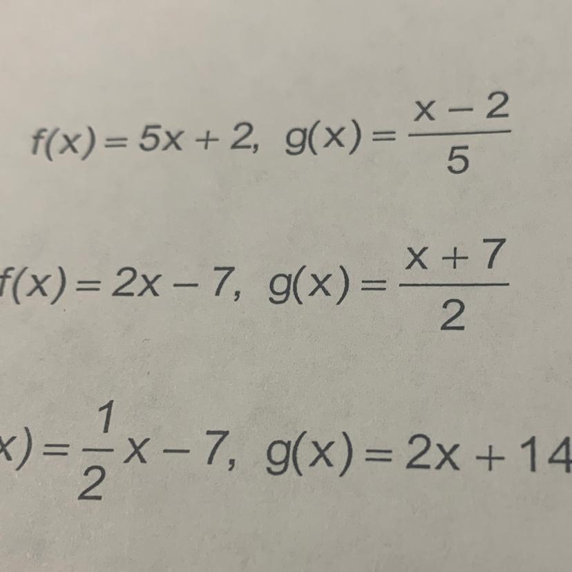 (f ∘ g)(x) = f(g(x)) = f(0.5(x + 7)) = 2[0.5(x + 7)] - 7 = x + 7 - 7 = x.