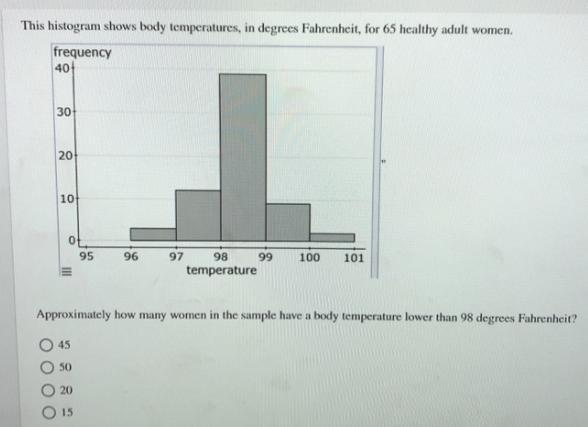 This histogram shows body temperatures, in degrees Fahrenheit, for 65 healthy adult women. frequency 40 97 98 99 temperature 100 101 Approximately how many women in the sample have a body temperature lower than 98 degrees Fahrenheit?