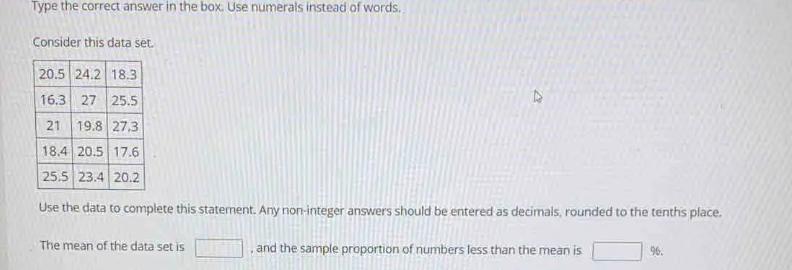 Hence, for the given data set the mean of the data set is 21.7, and the sample proportion of numbers less than the mean is 60%.