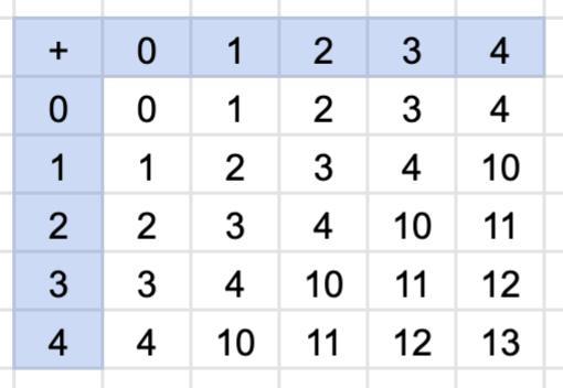 Each column gets the sum mod 5, with a carry to the next column of the quotient of the sum and 5. For example, in the units column, 2+4 = 11₅, so 1 is written in the units column as the sum, and 1 is carried to the 5s column (next one to the left).
