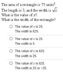Given the area and length of the rectangle, the value of x is 625 and the value of the width is 25.