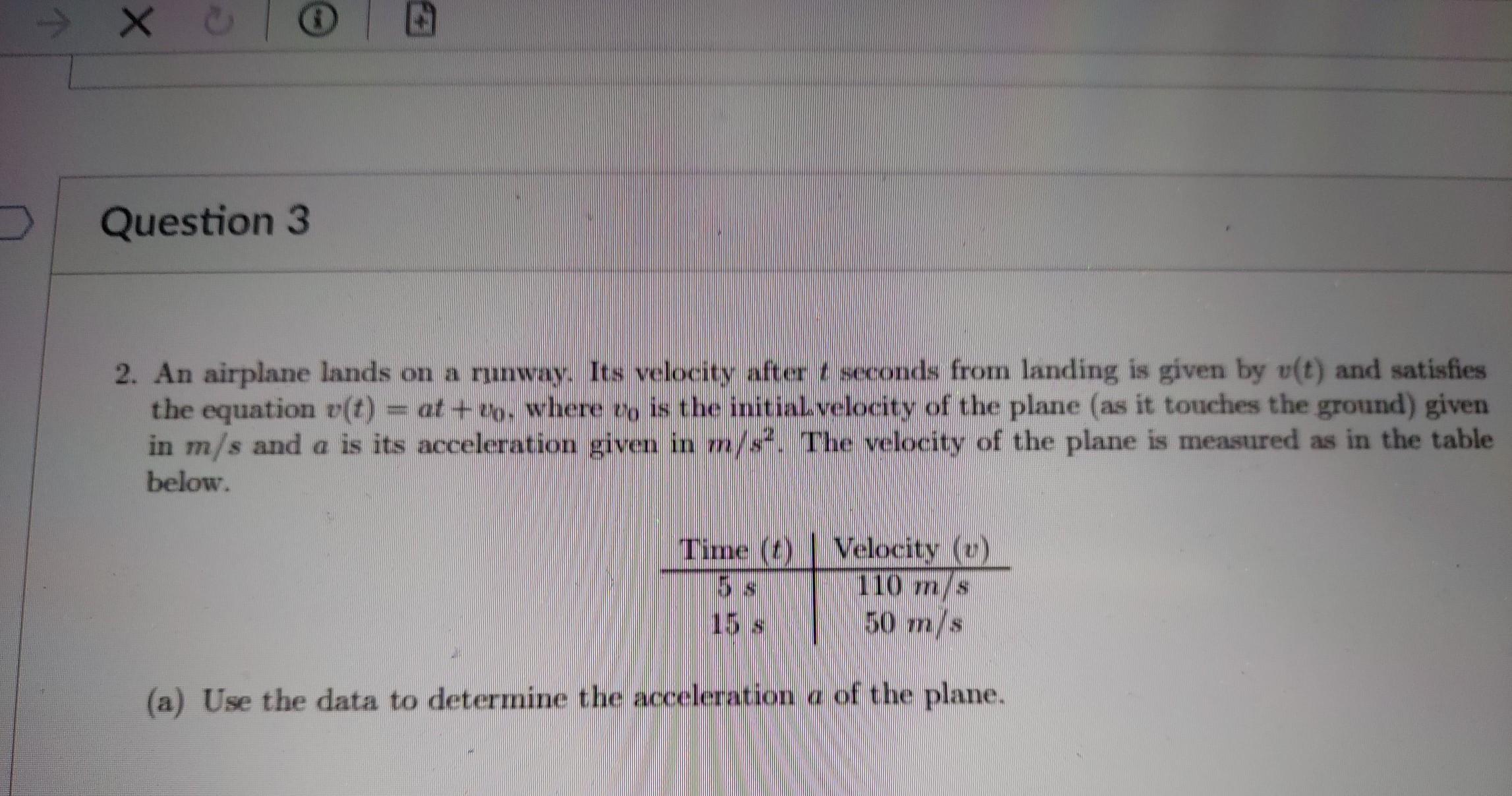 We are not given the velocity of the plane at landing but we are given velocities at two time periods